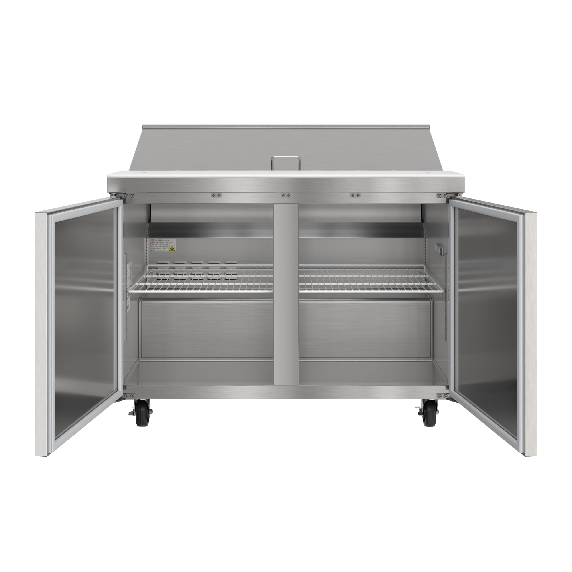 It's spacious 14 cu. ft. refrigerated compartment includes 2 heavy-duty, adjustable shelves for flexible ingredient storage, while the top prep well holds twelve included 1/6 GN pans—ideal for sandwich toppings or salad ingredients.