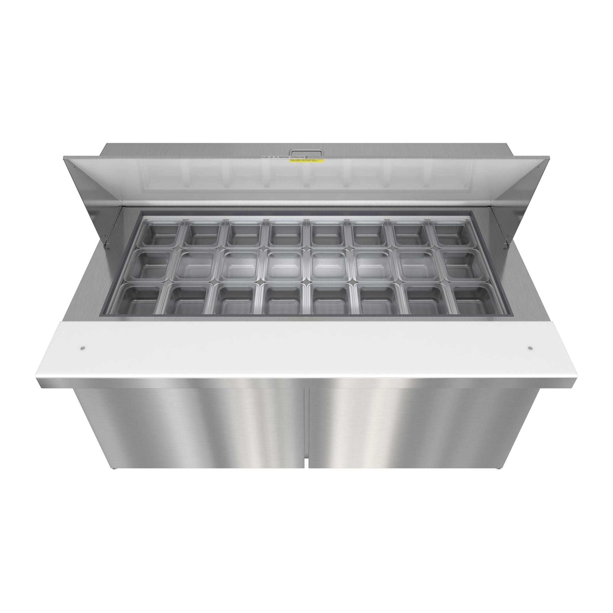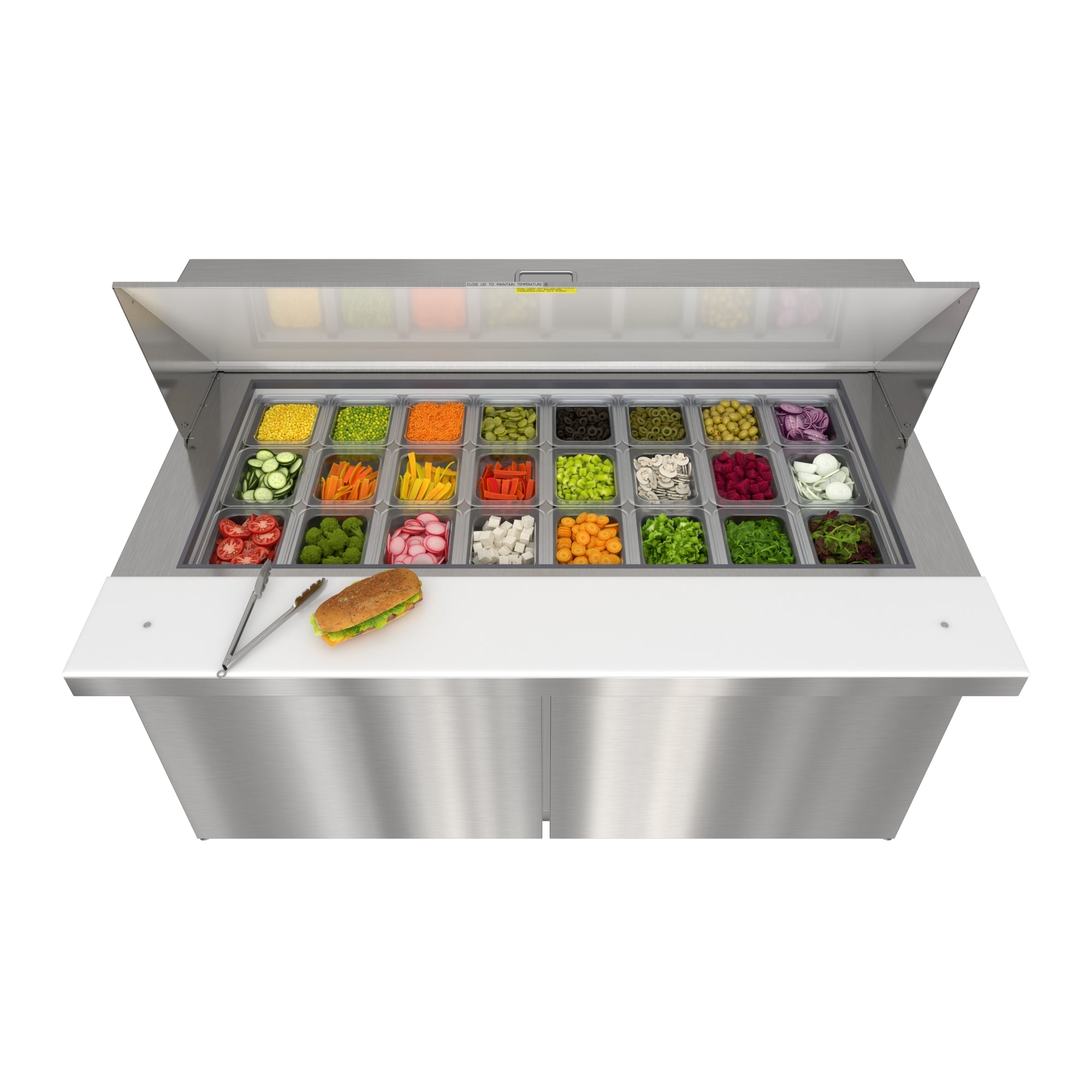 The mega top compartment accommodates twenty-four 1/6 GN pans, with plastic pans included—ideal for sandwiches, salads, and deli prep.
